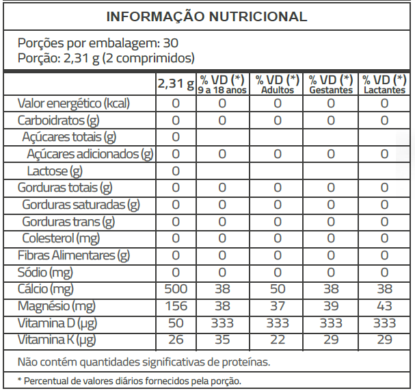 Cálcio (Carbonato de Cálcio), Magnésio (Óxido de Magnésio), Vitamina D (Colecalciferol), Vitamina K (Menaquinona-7), Agente de massa: Celulose Microcristalina; Estabilizantes: Croscarmelose sódica e Hidroxipropilmetilcelulose; Antiumectantes: Estearato de Magnésio e Dióxido de silício coloidal; Agente carreador: Polietilenoglicol e Corante Dióxido de titânio.