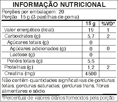 Creatina monohidratada, triglicerídeos de cadeia média, agentes de massa xarope de maltitol e xarope de sorbitol, gelificantes gelatina e pectina, acidulantes ácido cítrico e ácido lático, aroma idêntico ao natural de maçã verde, glaceante cera de carnaúba, conservador sorbato de potássio, corantes artificiais azul brilhante FCF e tartrazina, edulcorante sucralose e sequestrante EDTA cálcio dissódico. ALÉRGICOS: PODE CONTER PEIXE, CRUSTÁCEOS (LAGOSTAS, CAMARÕES, CARANGUEJOS E SIRIS), LEITE E SOJA. NÃO CONTÉM GLÚTEN.