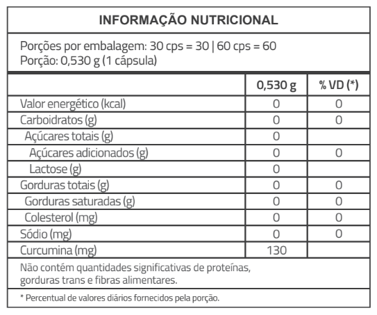 de rizomas de Curcuma longa L., cada cápsula contém 130 mg de curcumina, uma substância bioativa amplamente estudada.