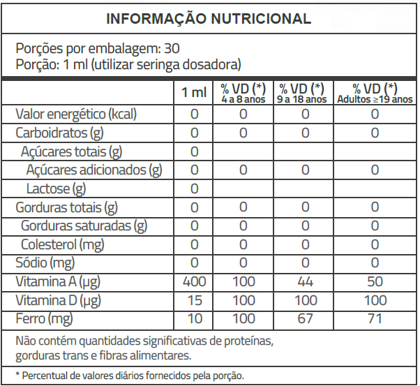 Água; Glicinato Férrico; Maltodextrina*; Colecalciferol; Acetato de Retinol; Agente de massa: Xarope de Sorbitol; Estabilizante: Glicerol; Aromatizante: Aroma artificial de Framboesa; Antioxidante: Ascorbato de sódio; Conservante: Sorbato de potássio; Espessante: Goma xantana; Reguladores de acidez: Citrato trissódico; Ácido cítrico; Acidulante: Ácido tartárico; Sequestrante: EDTA cálcio dissódico; Edulcorante: Sucralose. ALÉRGICOS: CONTÉM DERIVADOS DE SOJA. NÃO CONTÉM GLÚTEN.