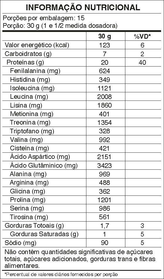 - Contém 9,46 g de Aminoácidos essenciais e 4,12g de BCAA por porção;